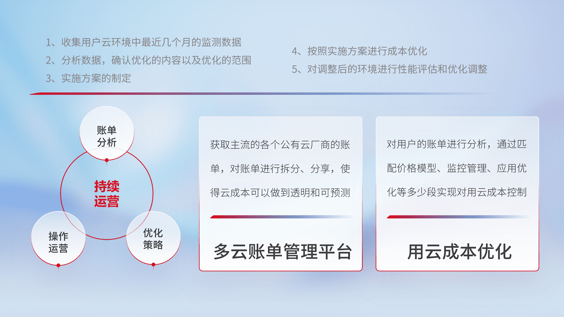 通过灵活运用多种自动化迁移工具,,,,帮助企业用户实现业务和数据高效 、、、稳定的上云迁移和云上迁移,,,采用自研多云纳管平台,,,,以中立管理模式,,解决多组织、、、多云、、多运维厂商的复杂关系的管理,,,保证多云平台资源配置的一致性,,,实时掌控云资源运行数据,,,,运用智能化工具分析云资源多云平台的管理服务,,,,透明化管理成本支出,,,用云成本可预测、、用云费用可优化、、、云资源配额有据可依。。。