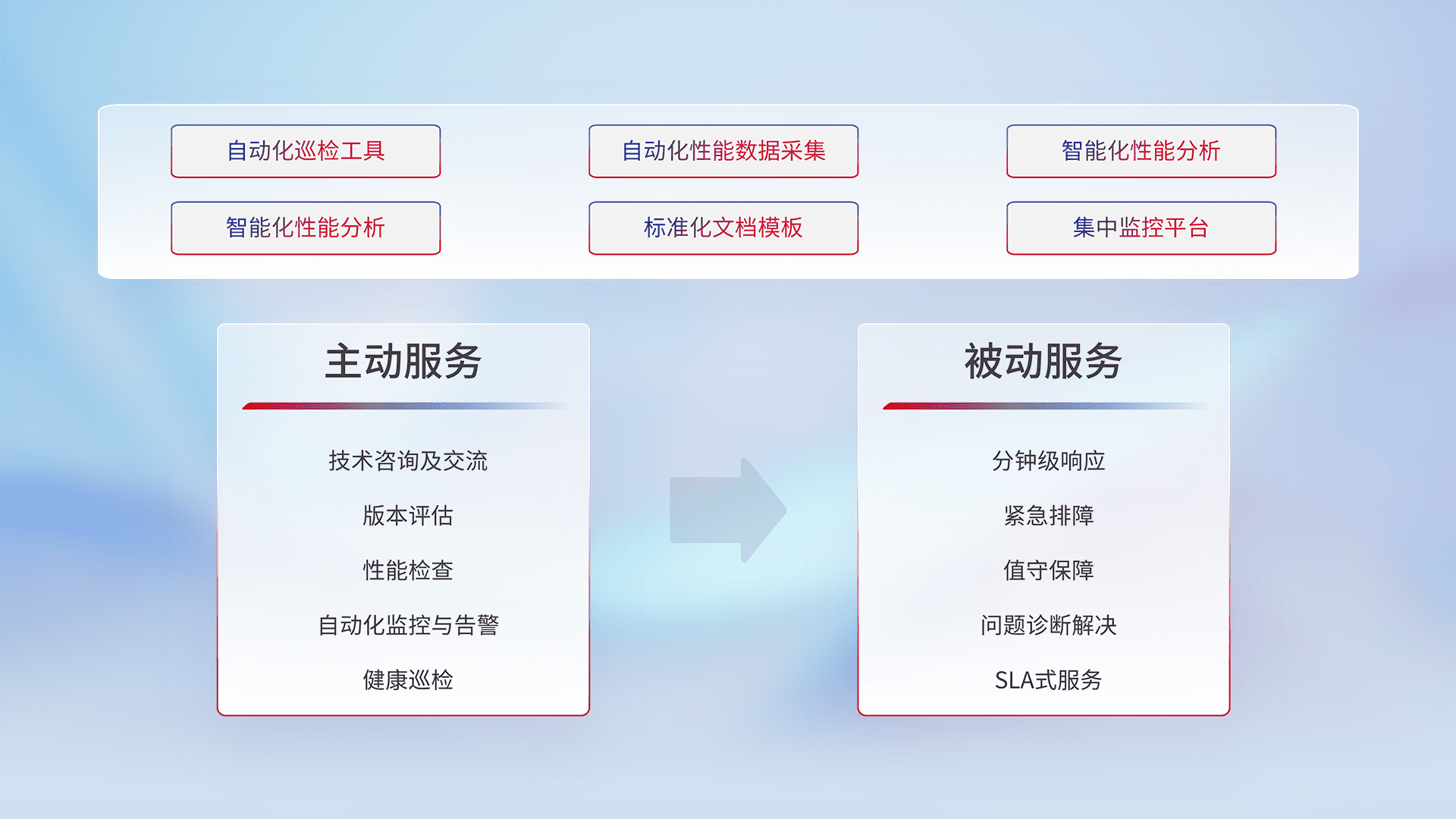 智能化工具和标准化文档,,,保障服务质量,,,提供主动服务(包含技术咨询、、版本评估、、性能检查、、自动化监控与告警、、、、健康巡检)和被动服务包含(分钟级响应、、紧急排障、、值守保障、、问题诊断解决、、SLA服务)。。。。
